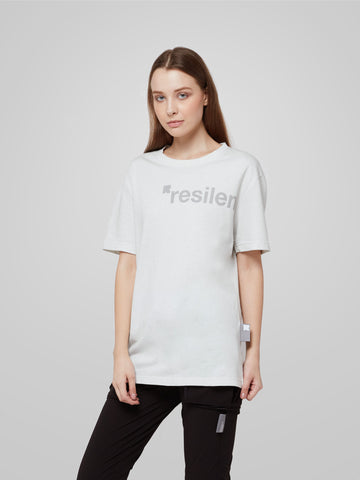 This white unisex T-shirt is highly utilitarian with a clean sporty feel, which fits nicely for your everyday choice. Sporting our Science of Resilience graphic prints, this shirt command simplicity both on and off the office, from street to nightclub. The fabric is using textured 100% off-white cotton with a medium thickness to help you combat heat yet strong enough to hustle all day long. Unisex with oversize style for a woman. The model is wearing a size M with a height of 170 cm.